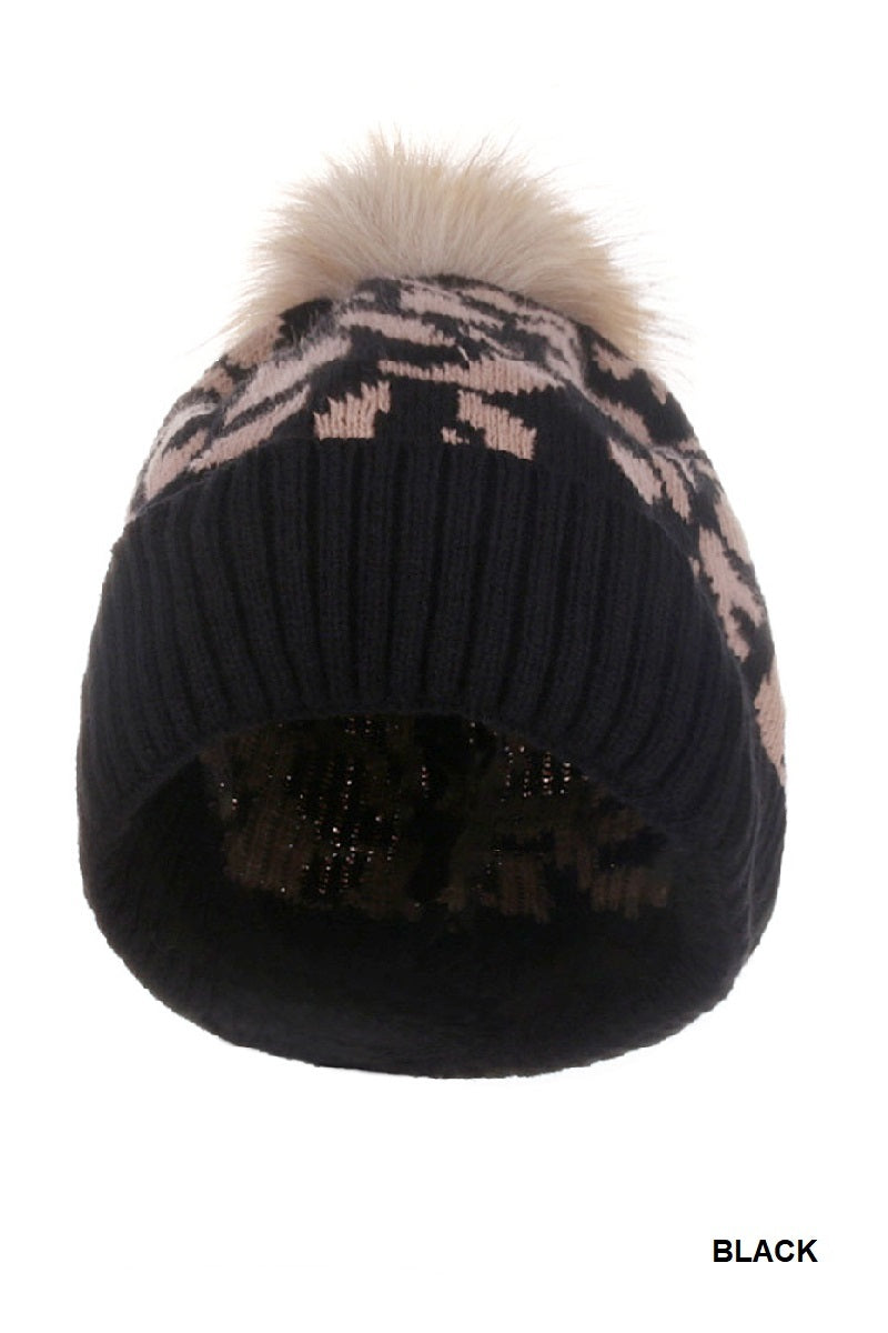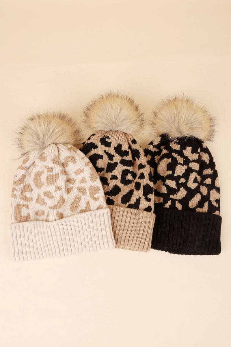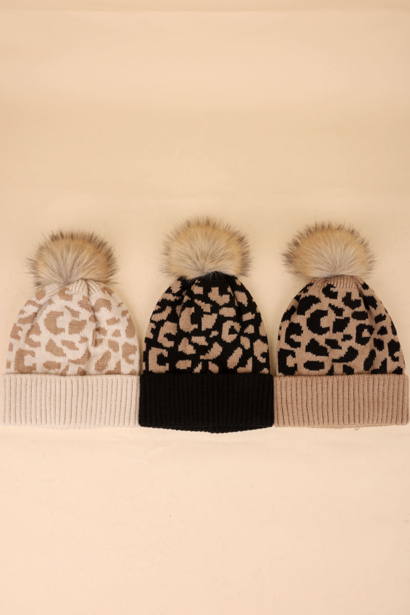 Leopard Print Knit Pom Pom Beanie – Cuffed Winter Hat, One Size Fits Most