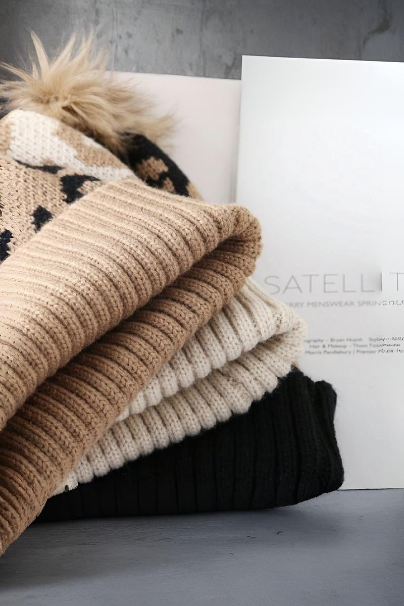 Beige knit beanie with leopard print pattern and pom-pom on a mannequin head against a white background.