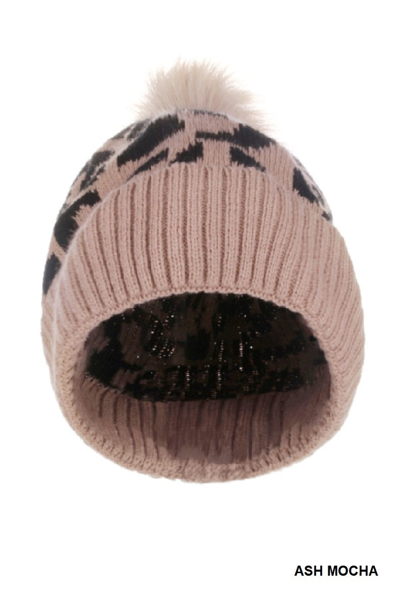 Knitted beanie with leopard print and fur pom-pom in ash mocha color on a white background.