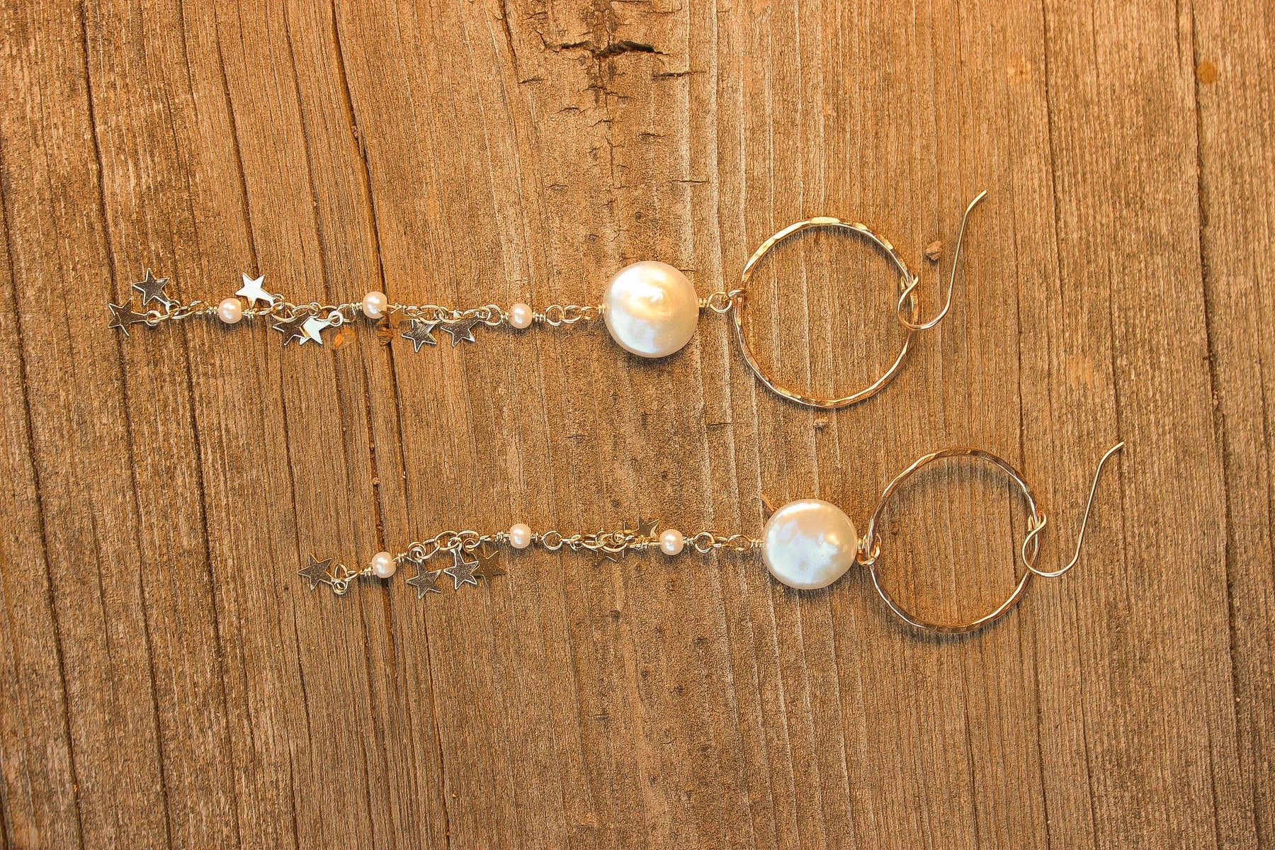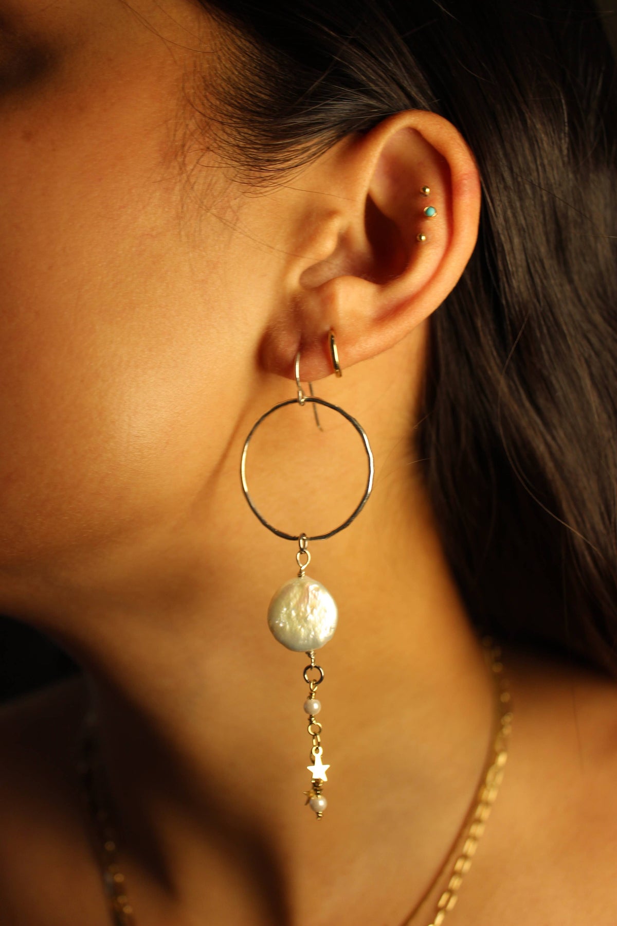 Shine like the night sky with the Sayuri Pearl Star Earrings, handmade in Santa Cruz, California. These elegant earrings feature a gold-filled small hoop adorned with a luminous baroque pearl, delicate keshi pearls, and a dangling star charm on a fine chain.