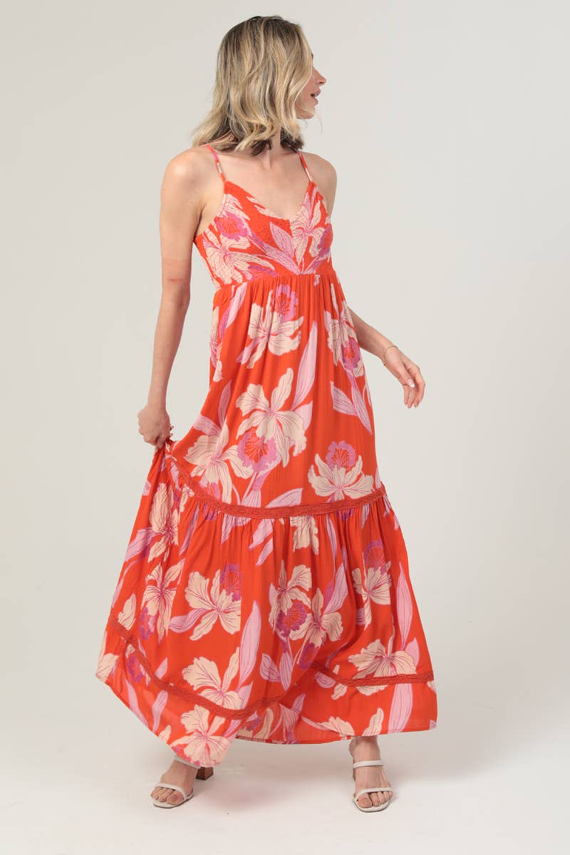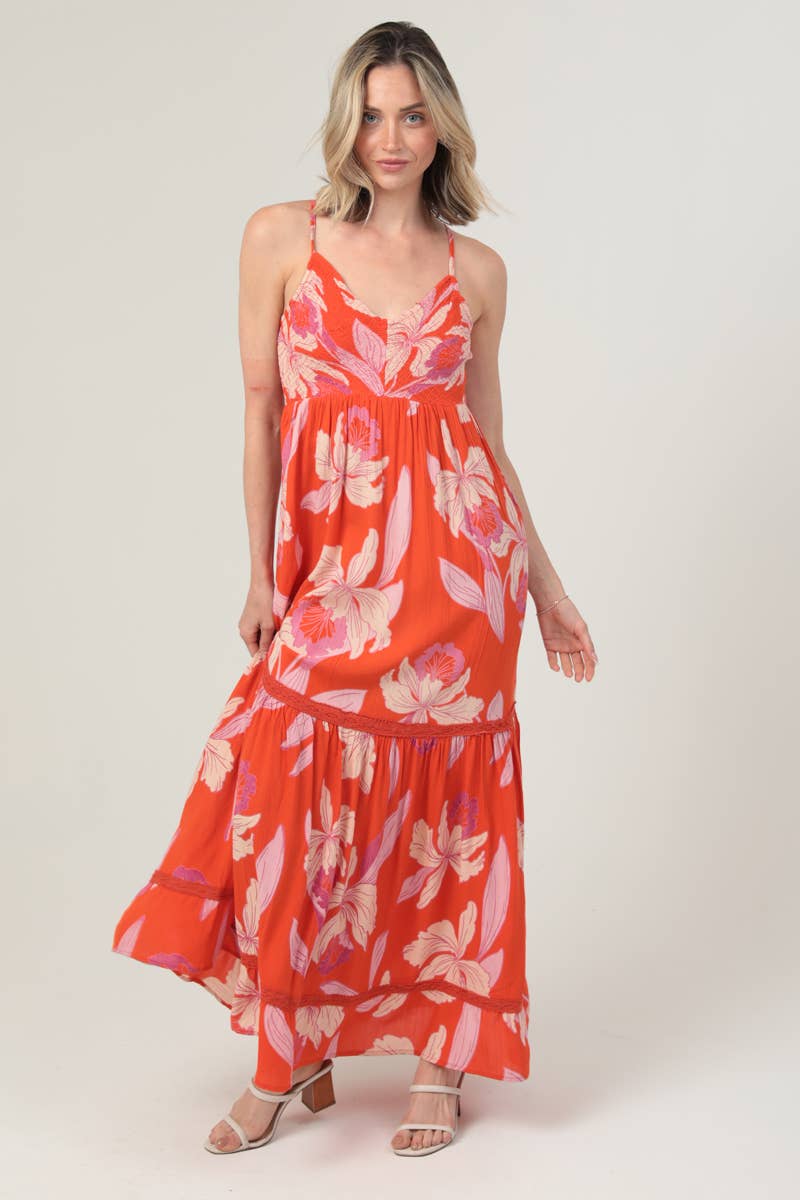 This floral maxi dress by Angie features a feminine V-neckline, delicate lace trim, and a comfortable smocked bust that offers shape without sacrificing comfort. The flowy tiered skirt moves beautifully, making it perfect for weddings, vacations, brunch, or sunset dinners.