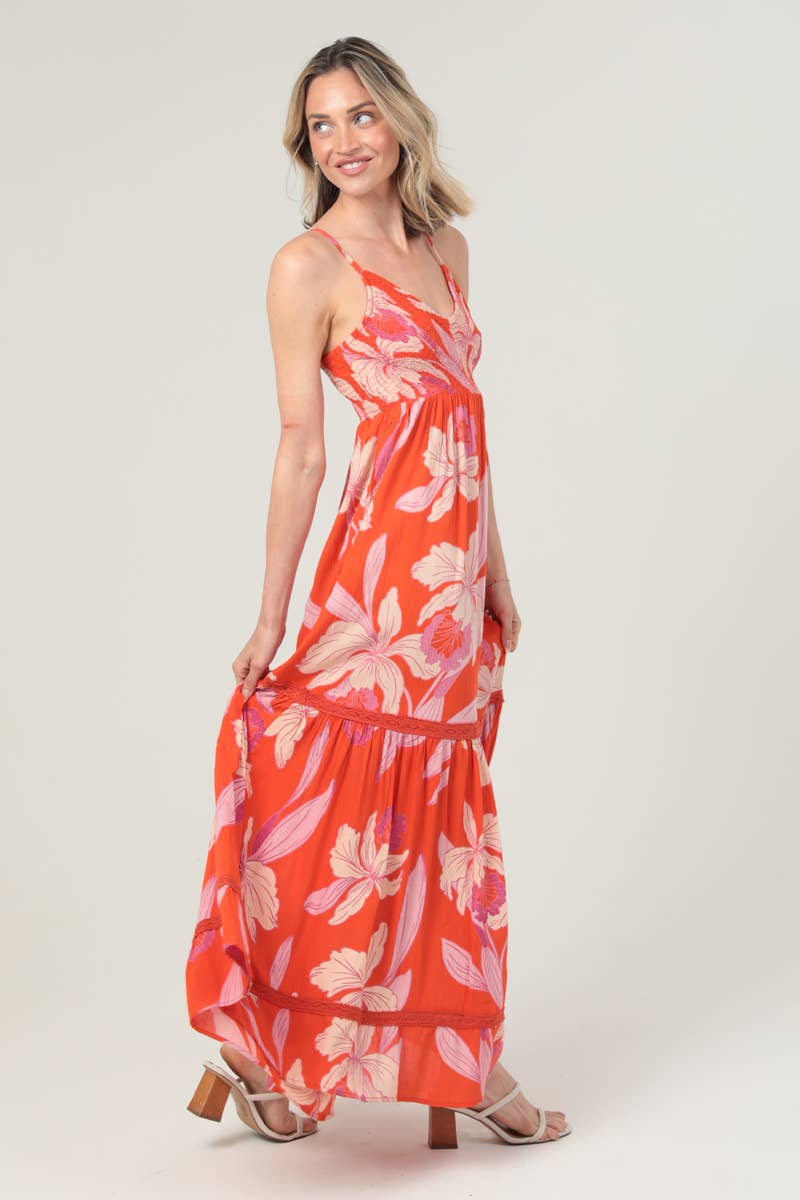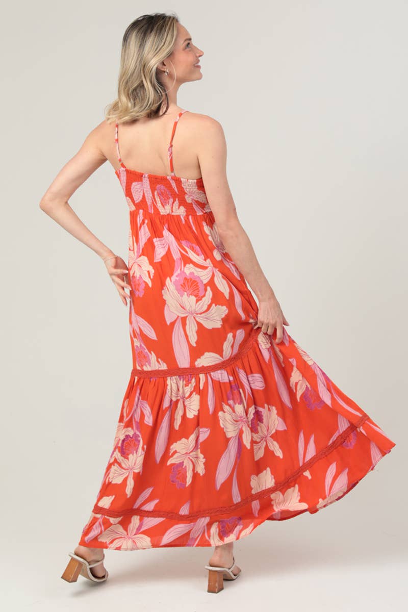 V-Neck Smocked Bust Floral Maxi Dress with Lace Trim – Angie