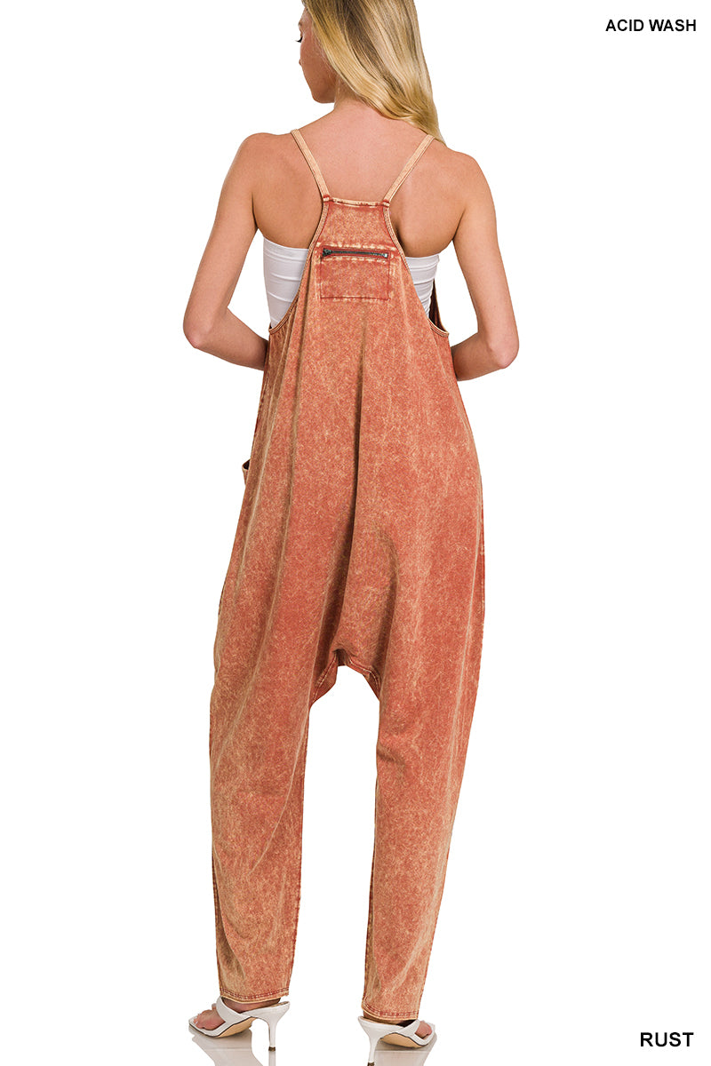 Woman wearing a rust-colored acid-wash overalls on a white background