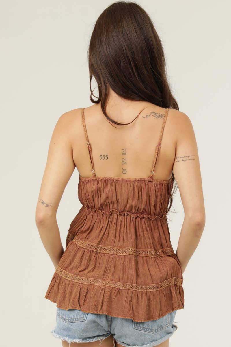 This acid wash cami tank top by Angie features a flattering V-neckline, delicate lace trim, and a soft, flowy silhouette that drapes beautifully. The acid wash finish adds a subtle vintage vibe, making this top perfect for casual days, warm weather, or layered looks year-round.