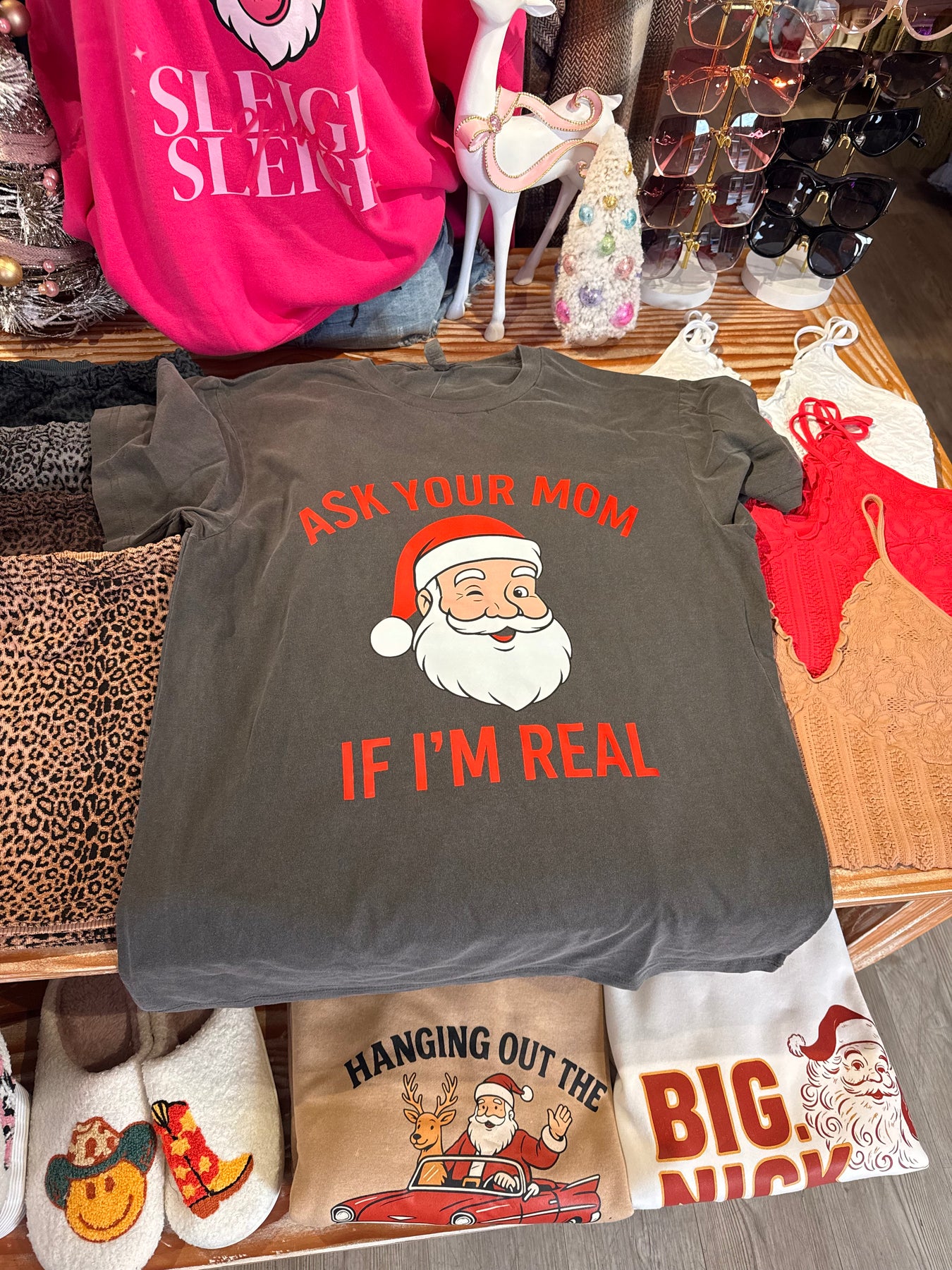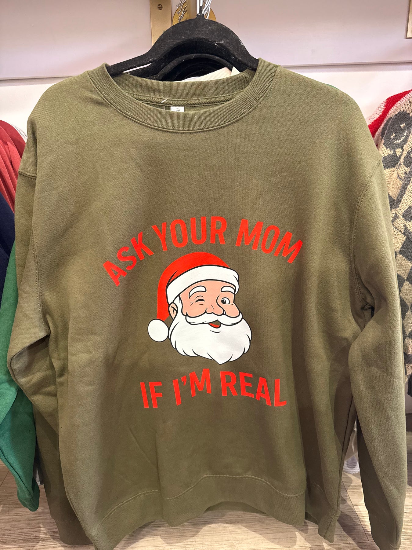 50/50 Cotton/Polyester Blend Unisex Fit, crew collar Colored Shirt: The "Ask Your Mother If I'm Real" green pullover