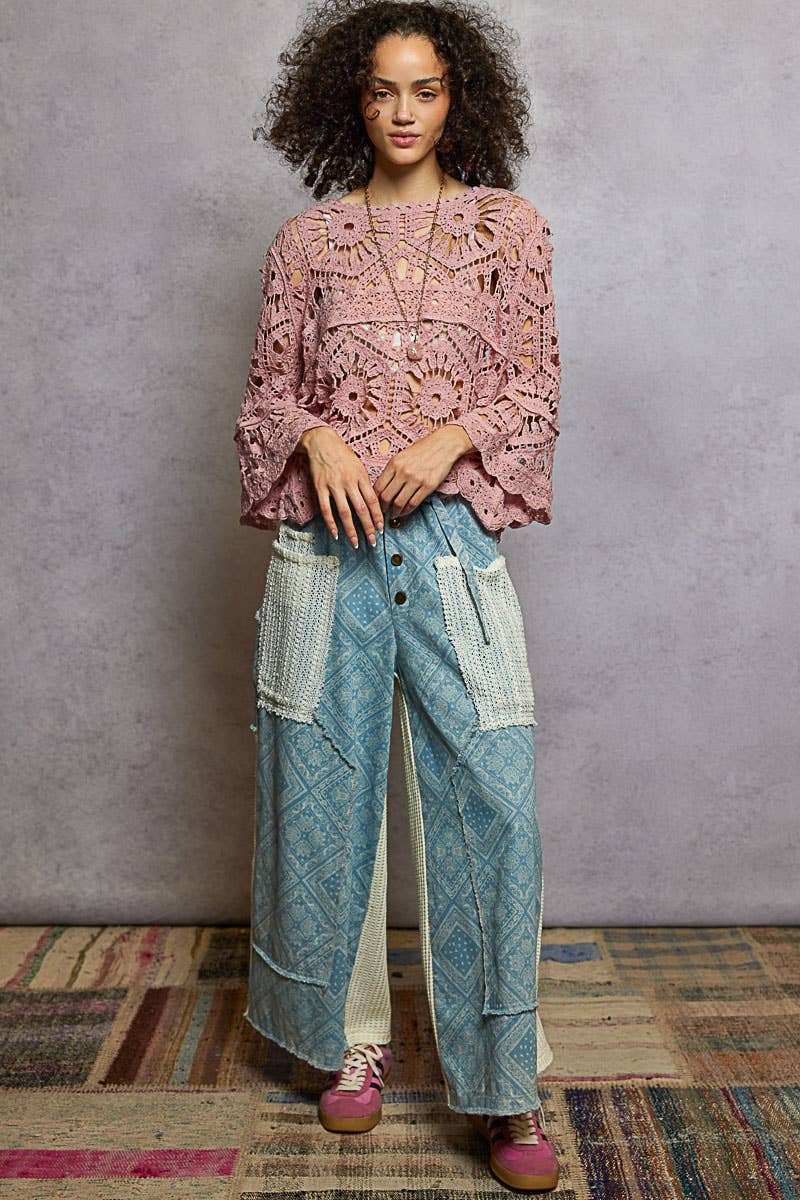 Add a touch of effortless bohemian charm with the Round Neck 3/4 Sleeve Crochet Cropped Top.