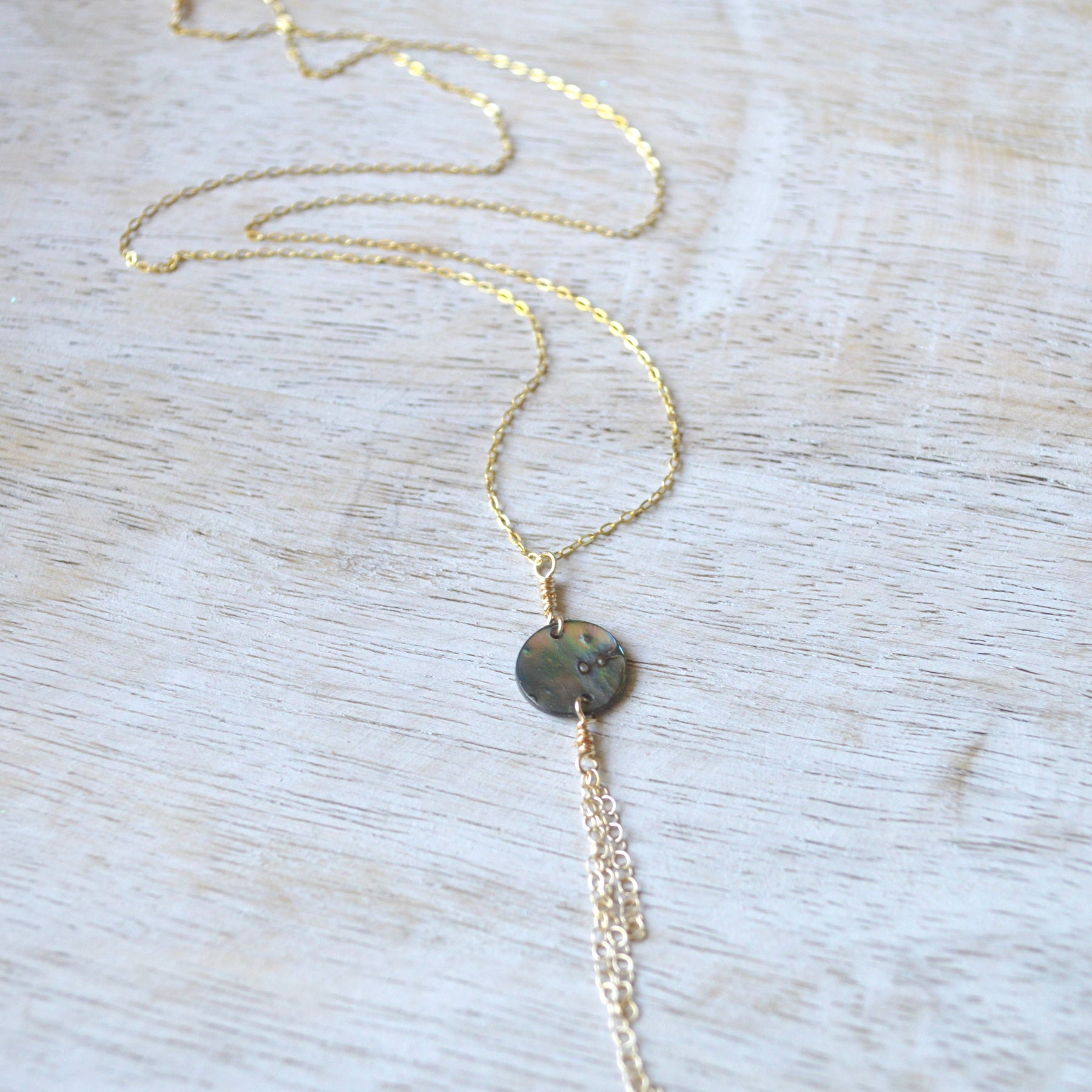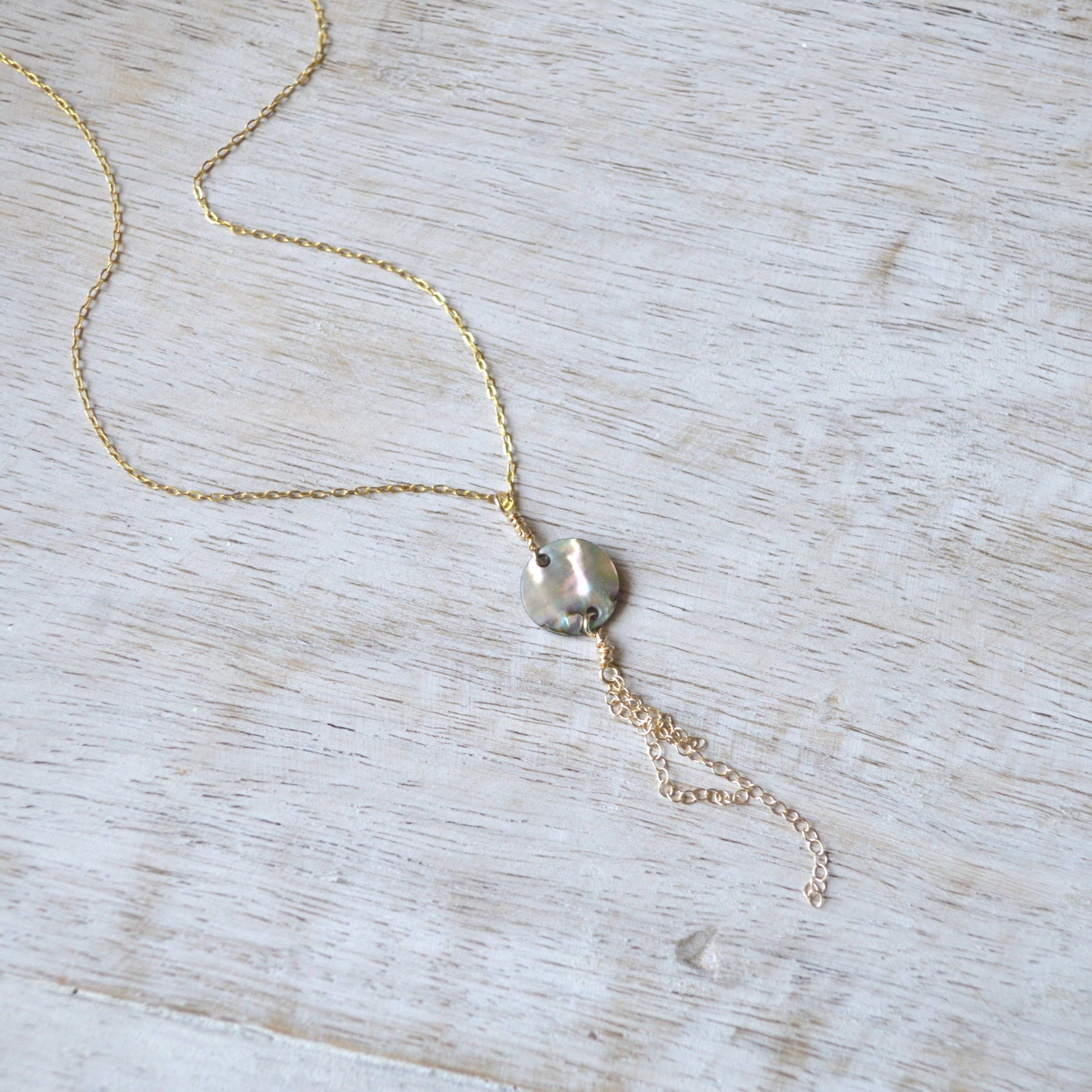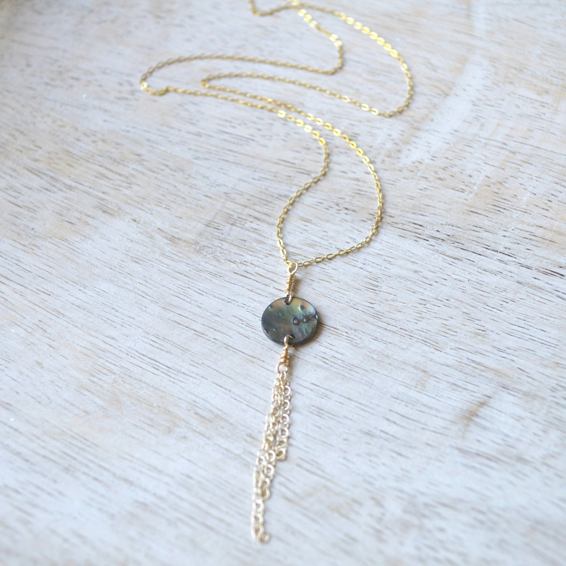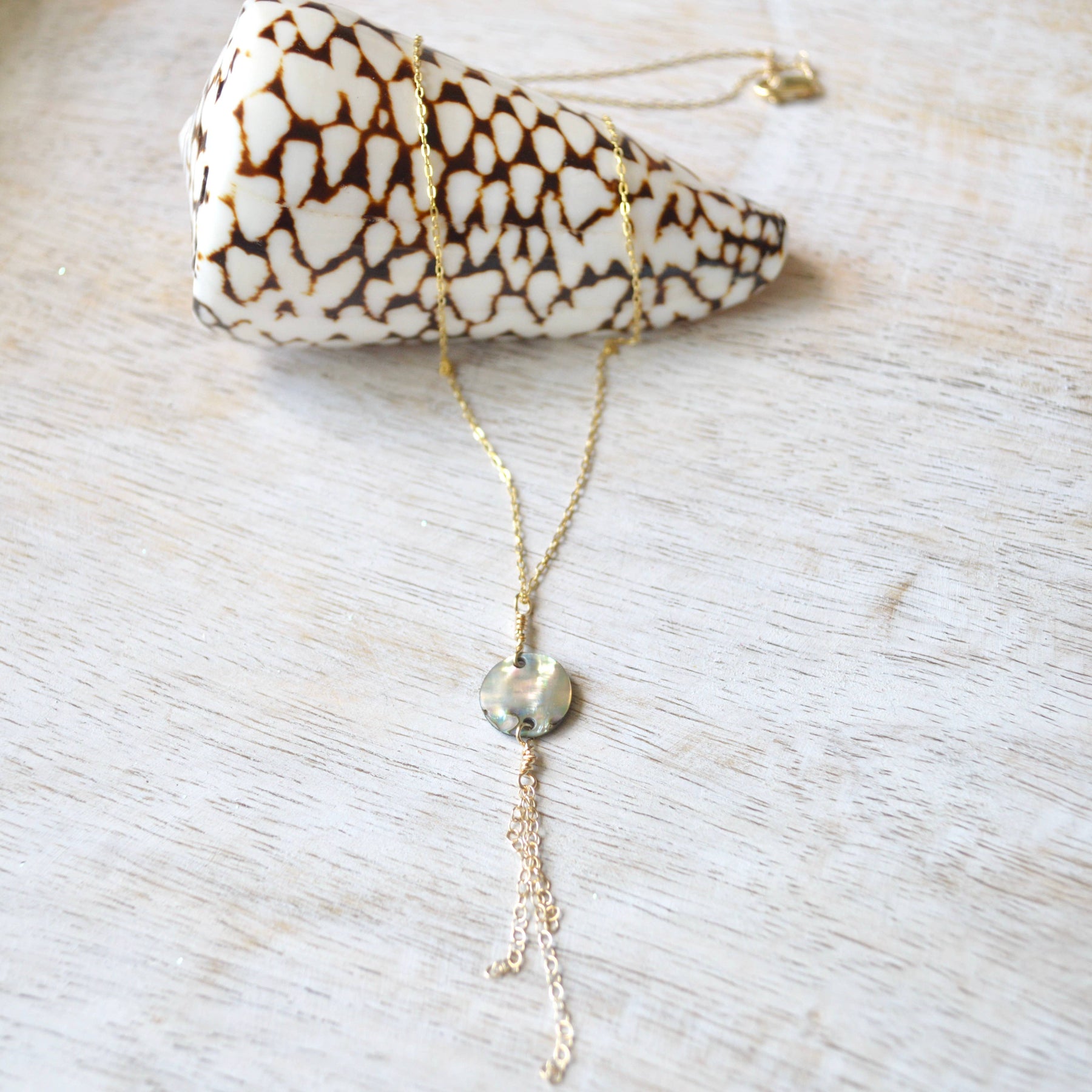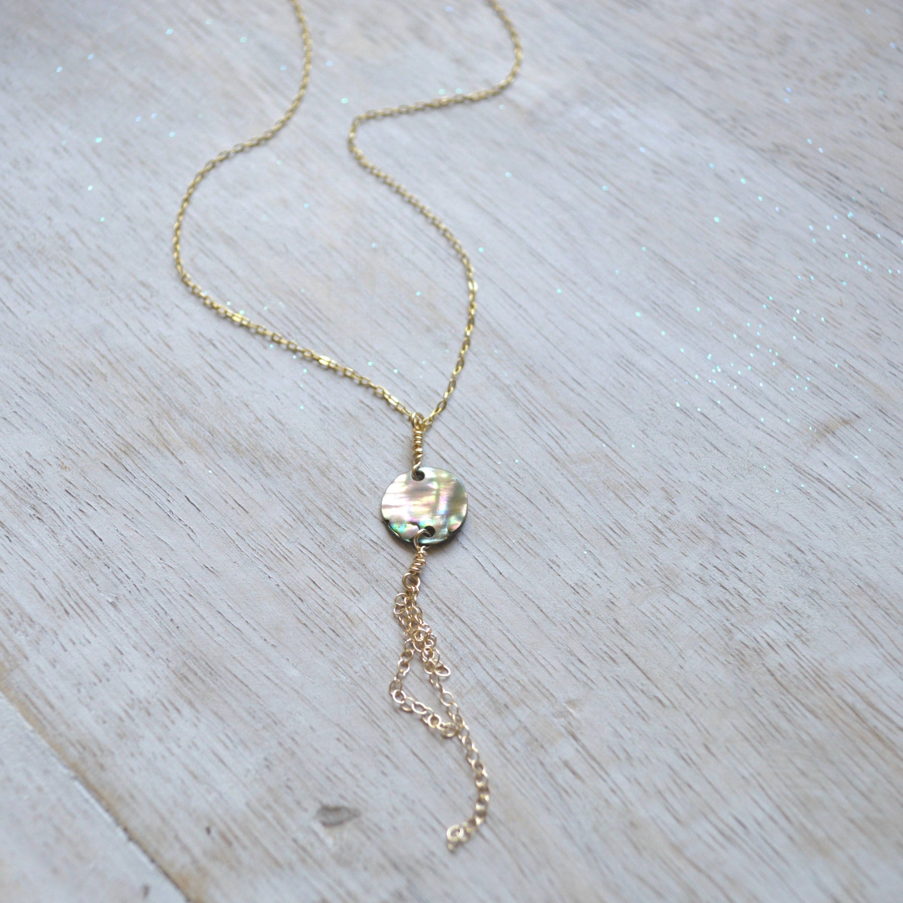 This dainty necklace features a tiny abalone shell with dangling gold filled chains. • 14k gold filled 1mm flat cable chain • 14k gold filled clasp • 10mm abalone shell Available in 15", 16" and 18" lengths. Perfect for layering or wearing solo, this delicate piece brings a pop of iridescent color to any outfit. The shimmering abalone shell catches the light beautifully, creating subtle rainbow flashes that dance with your every move. Crafted with quality 14k gold filled materials, it's built to last through countless adventures and special moments. Whether you're dressing up for a night out or adding a touch of coastal charm to your everyday look, this versatile necklace is your new go-to accessory. Choose your ideal length to customize the perfect fit for your style.