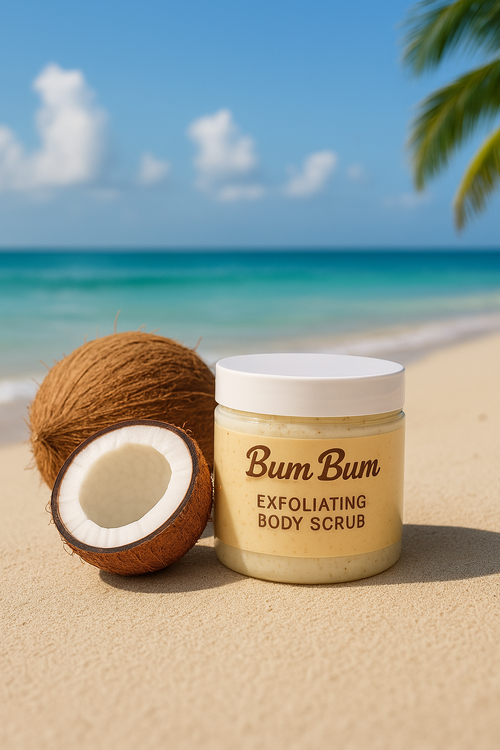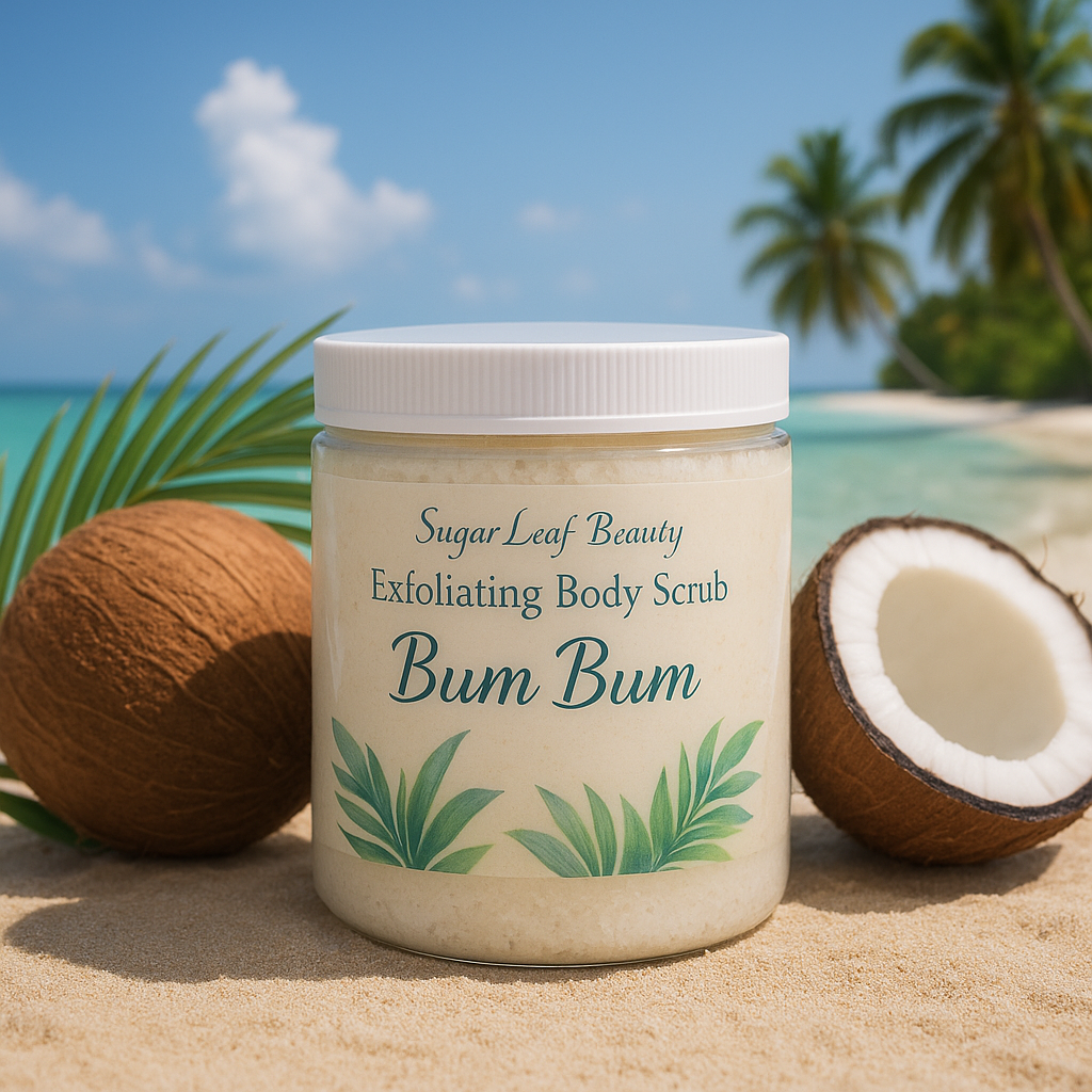 Jar of Sugar Leaf Beauty Exfoliating Body Scrub Bum Bum on a beach with coconuts and palm trees.