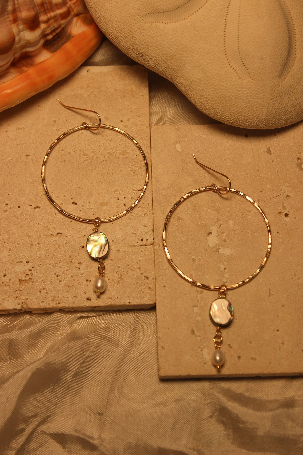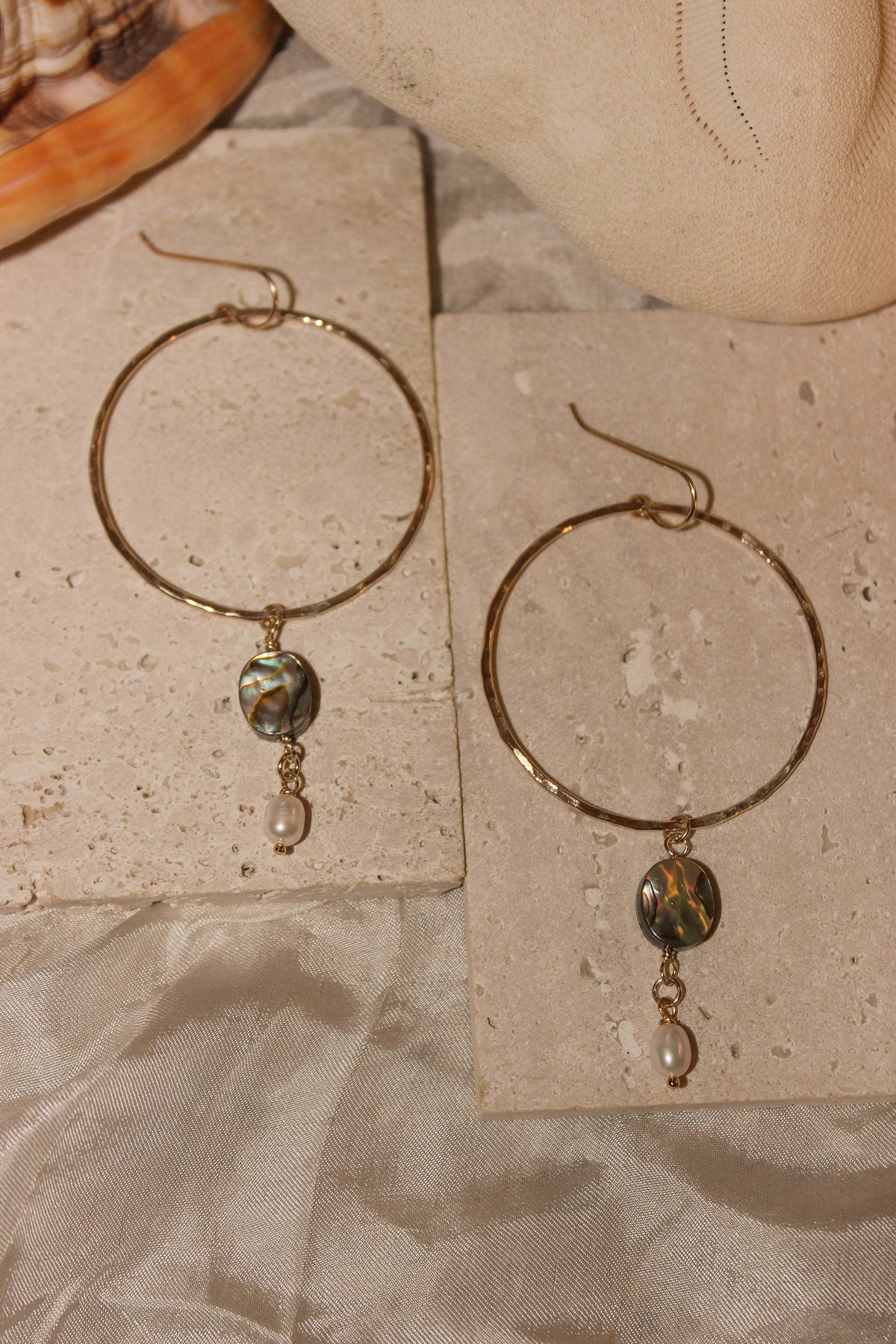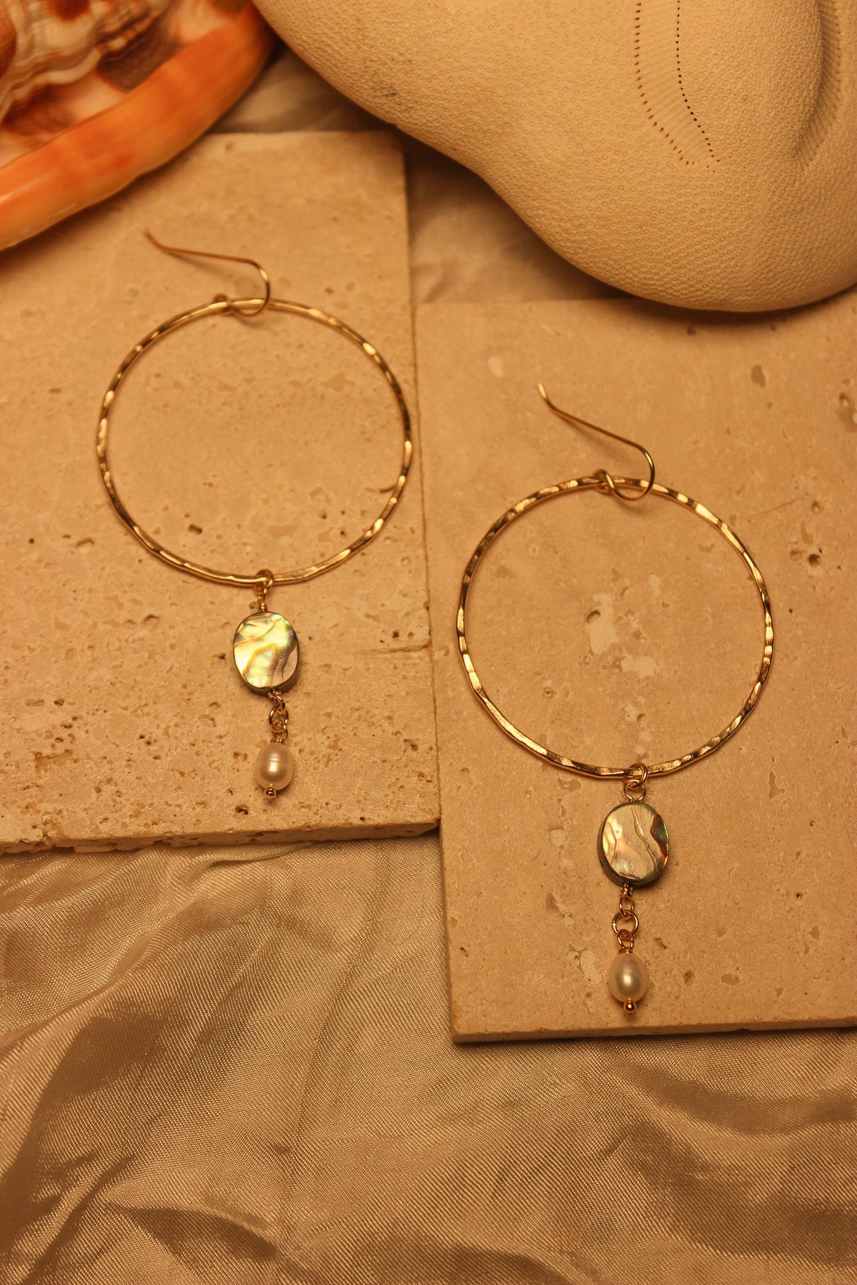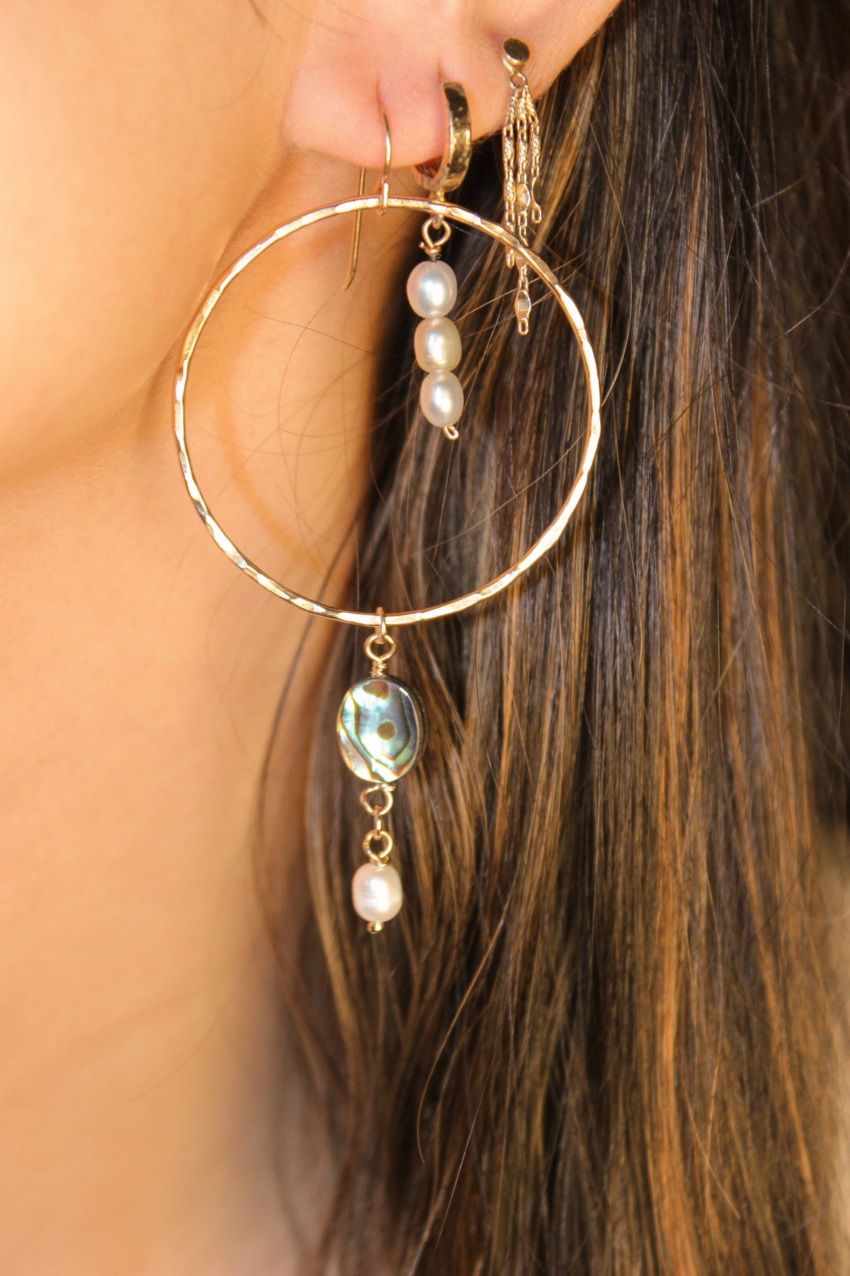 Expertly crafted with hammered gold filled hoops, the Bondi Big Hoops are statement earrings that elevate any outfit. Featuring an oval abalone and white keshi pearl, these hoops exude sophistication and elegance. Perfect for any occasion, these earrings are a must-have for any fashion-forward individual. Around 2” in diameter.