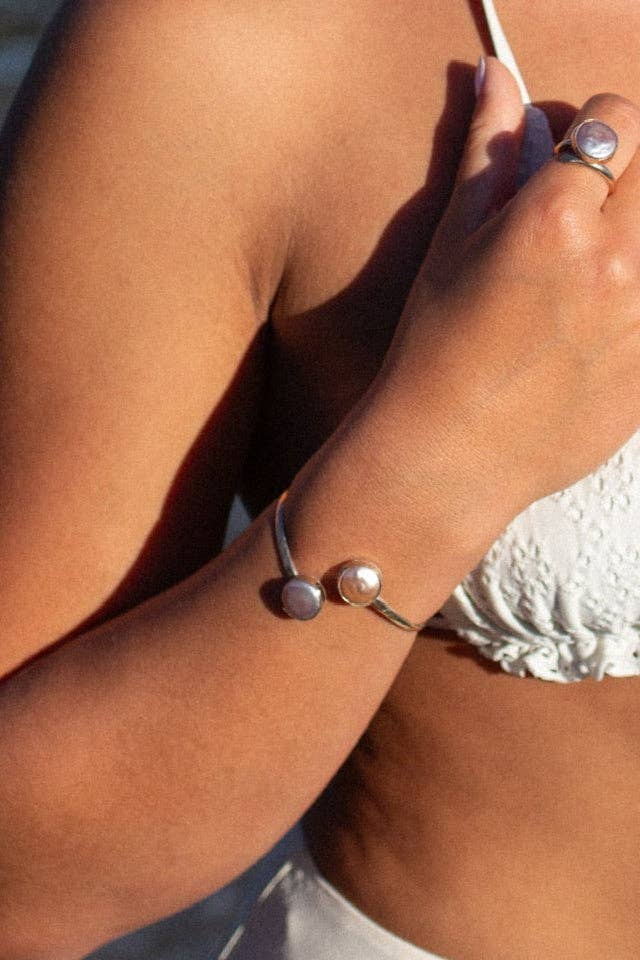 This 8" gold-filled cuff blends coastal elegance with a touch of rugged charm. Featuring luminous pink pearls set in hand-soldered bezels with sterling silver back plates, the design is both refined and grounded—just like Cayucos itself. Adjustable by gently squeezing or widening the band, it’s made to fit comfortably and move with you. Whether you're collecting sea glass at low tide or grabbing fish tacos on Ocean Ave, this piece is a little bit vintage, a little bit beach town magic.