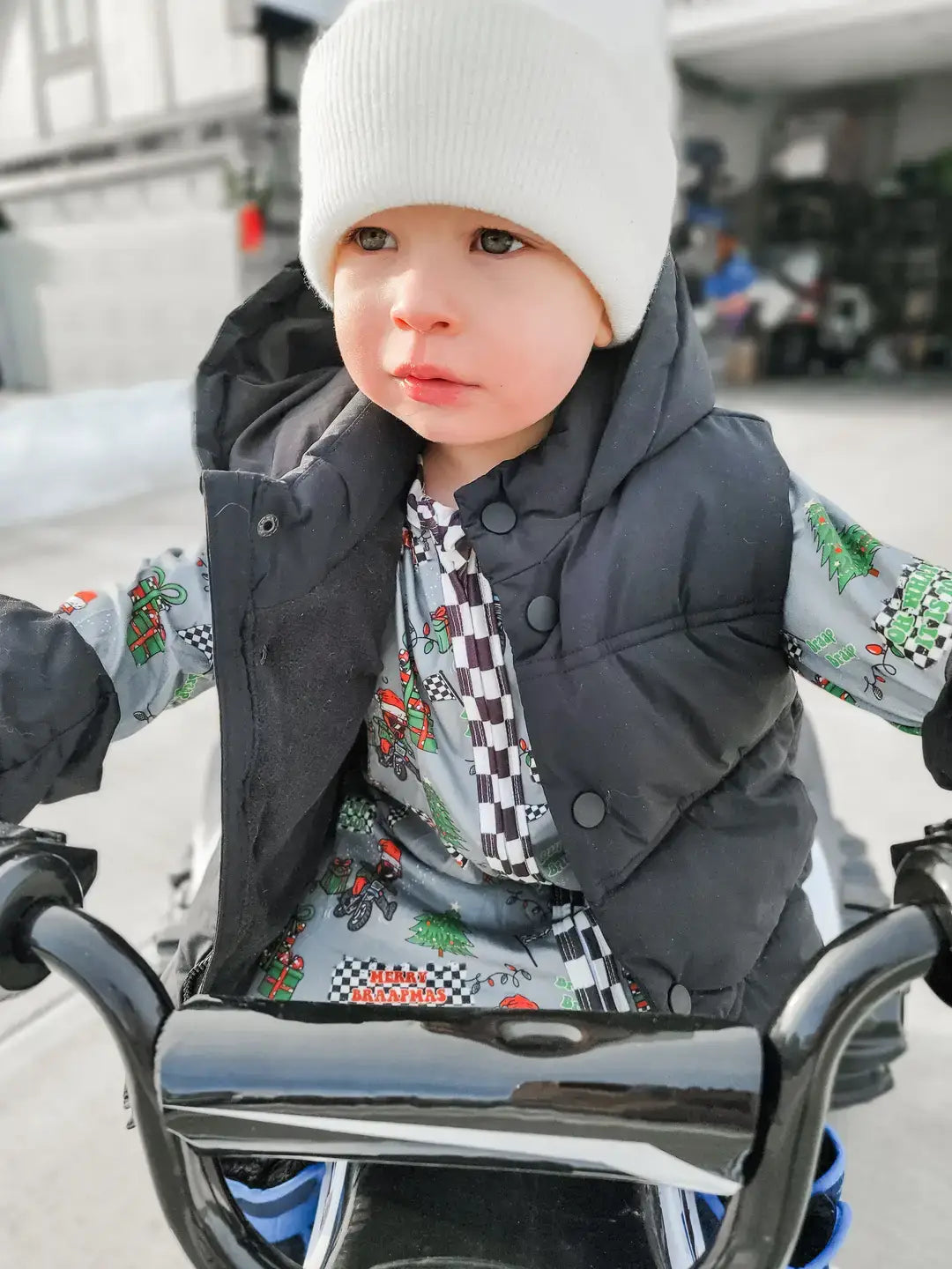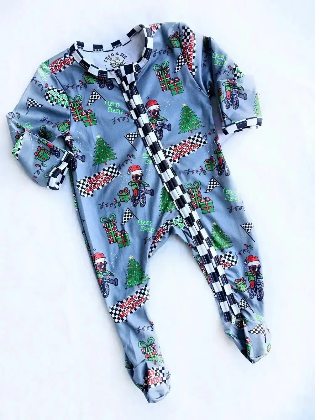 Rev up the holiday cheer with our custom Christmas Dirt Bike Print, designed exclusively for Ruffles and Bowties! This festive romper is part of our unique holiday collection—perfect for starting Christmas Eve traditions or winding down after a day full of merry fun. Made with convertible fold-over hands and footies, it easily transitions from playful days to cozy nights. Soft, comfy, and full of holiday spirit, it’s the perfect outfit for your little one this season! Details:
