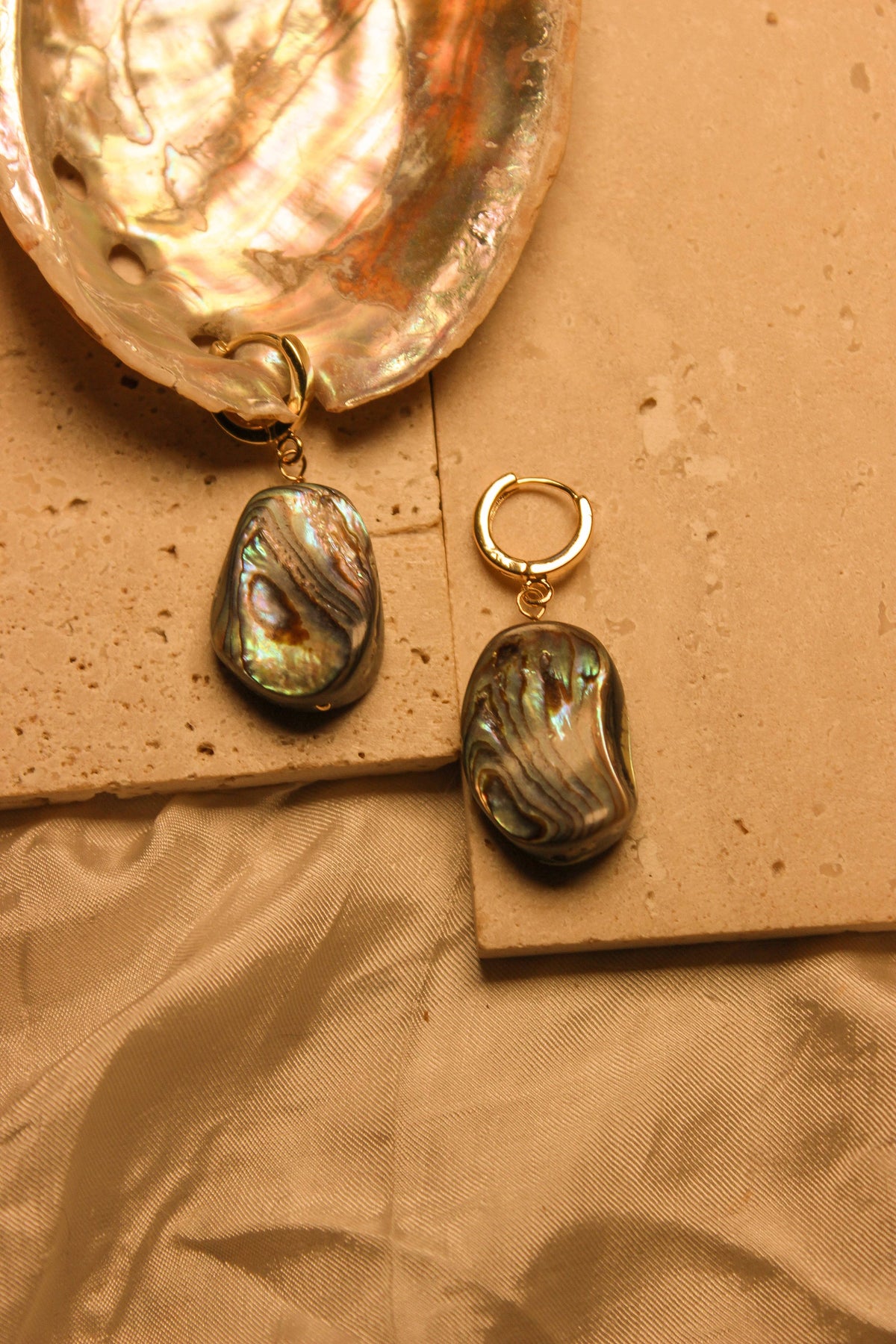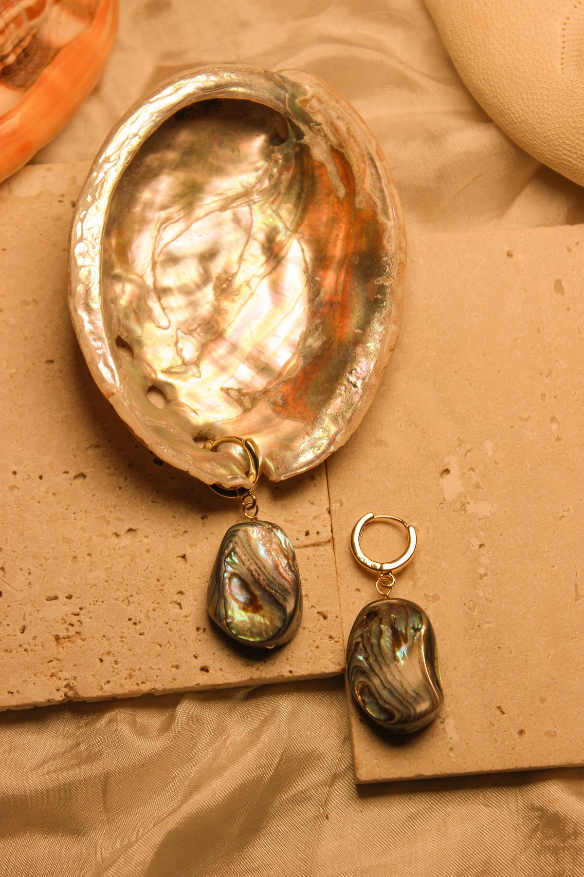 Ocean-born and made to shine. These gold filled, water resistant huggies carry a single polished slab of natural abalone — each one full of depth, shimmer, and coastal soul. No two are alike, just like tide-worn stones you’d pocket on a walk up the Pacific coast. Bold, lightweight, and full of movement.