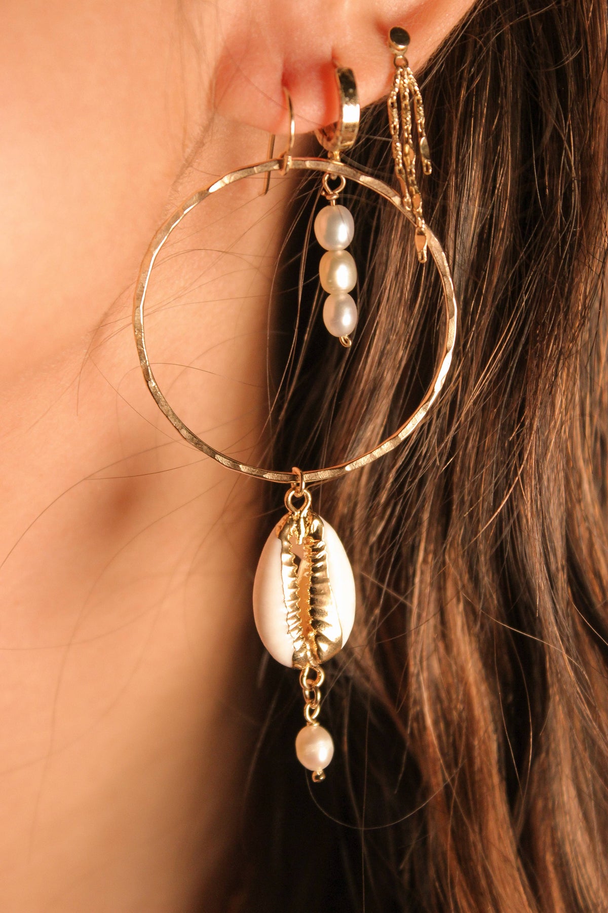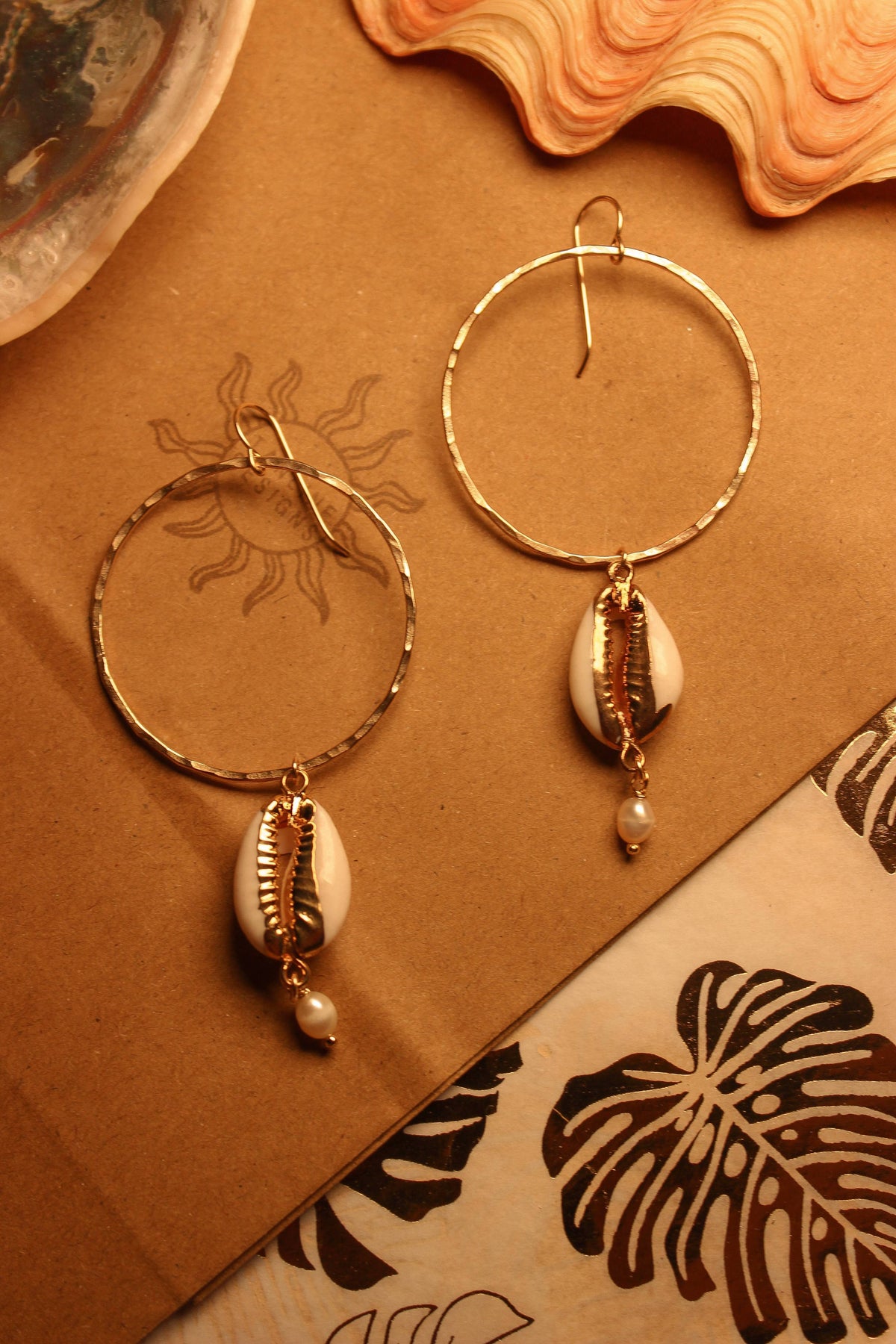 A statement of sea and shine — these hammered hoops feature a cowrie shell electroplated in gold and finished with a delicate pearl drop. The hoops themselves are 14k gold filled, water resistant, and non tarnishing, while the shell is best kept away from water to preserve its finish. A balance of natural beauty and luminous detail, they bring a touch of the tide wherever you go.