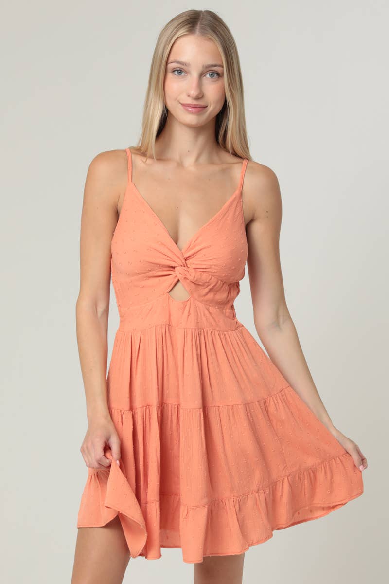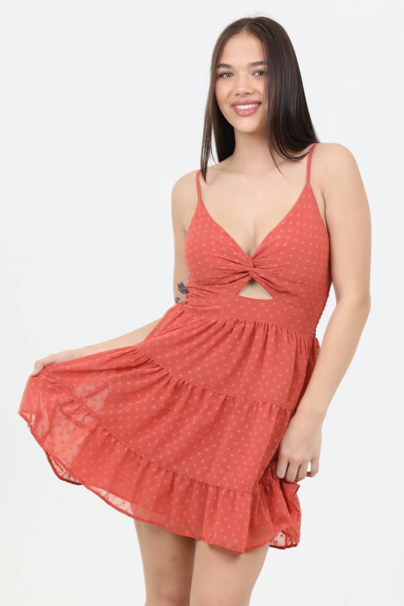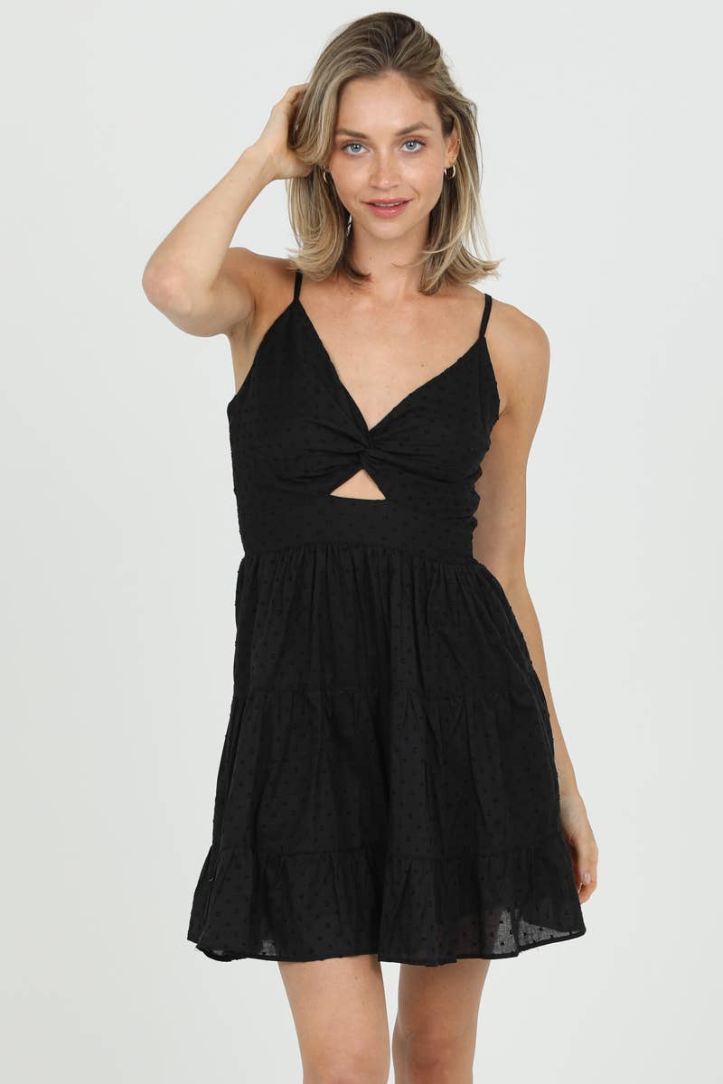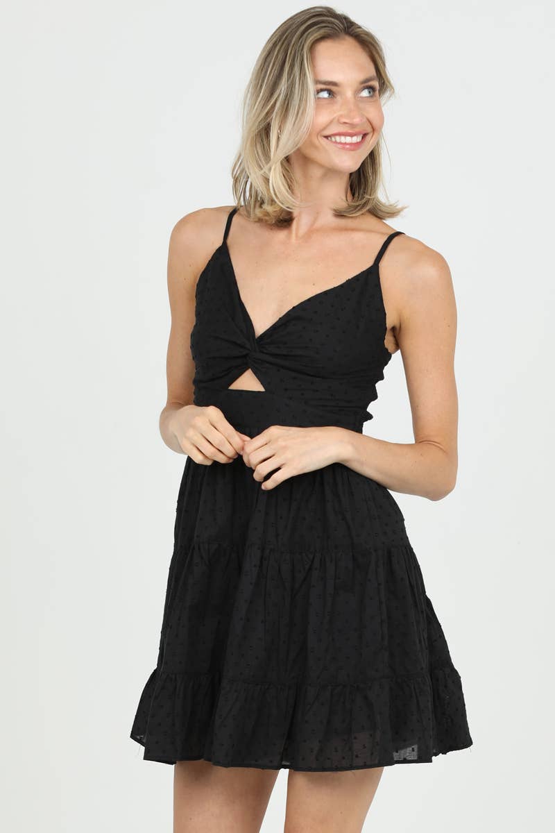 Meet the dress that does all the flirting for you. Our Swiss Dot Twist Front Cut-Out Mini Dress is the perfect blend of sweet + spicy — soft Swiss dot texture, a twist-front neckline, and a subtle center cut-out that adds just the right amount of sass.