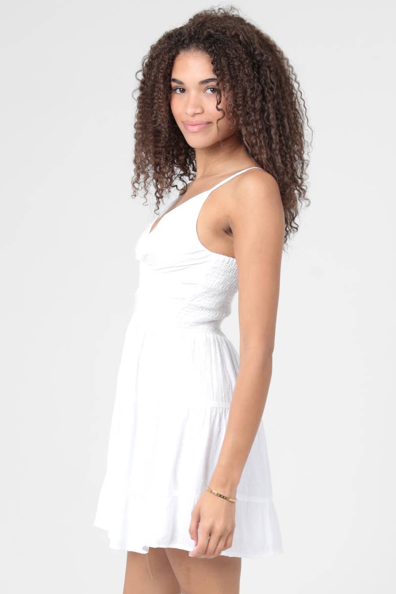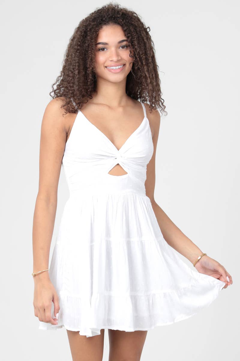 Swiss Dot Twist Front Cut-Out Mini Dress – White & Olive Summer Dress