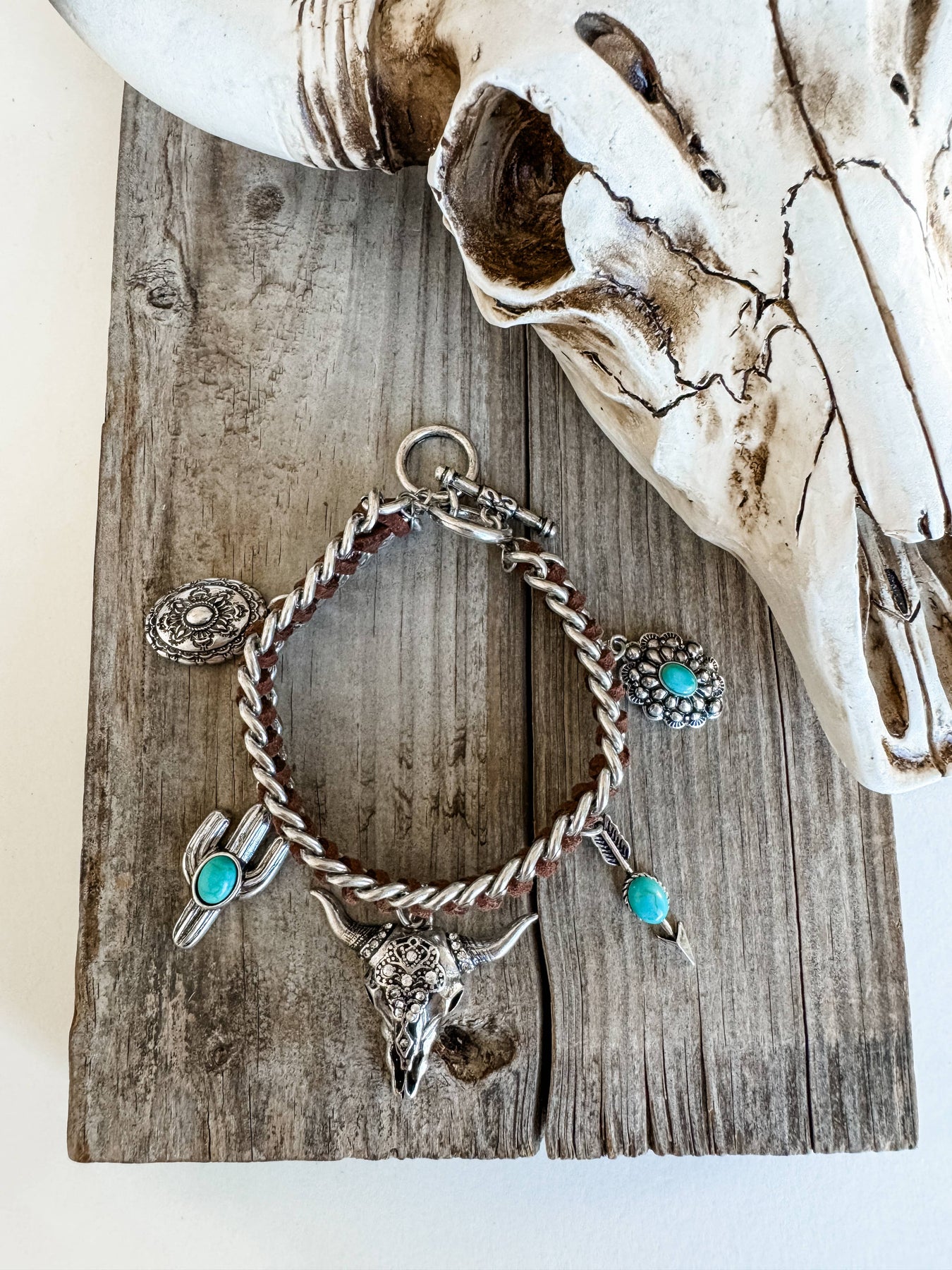 Saddle up for some serious Western style with this eye-catching Concho Stretch Bracelet! Featuring a striking cactus arrow and steer conch design, this stackable beauty brings authentic cowboy charm straight to your wrist. Crafted with natural stone and finished in burnished silver, it's the perfect accessory for anyone who loves that rustic, Southwestern vibe. The comfortable stretch fit means no fussing with clasps—just slip it on and go. Mix and match with other pieces to create your own personalized stack, or let this stunner shine solo. Whether you're heading to a rodeo, a music festival, or just want to add some playful Western flair to your everyday look, this versatile cuff bracelet delivers authentic style with a fun twist. Each order includes one bracelet ready to make a statement.