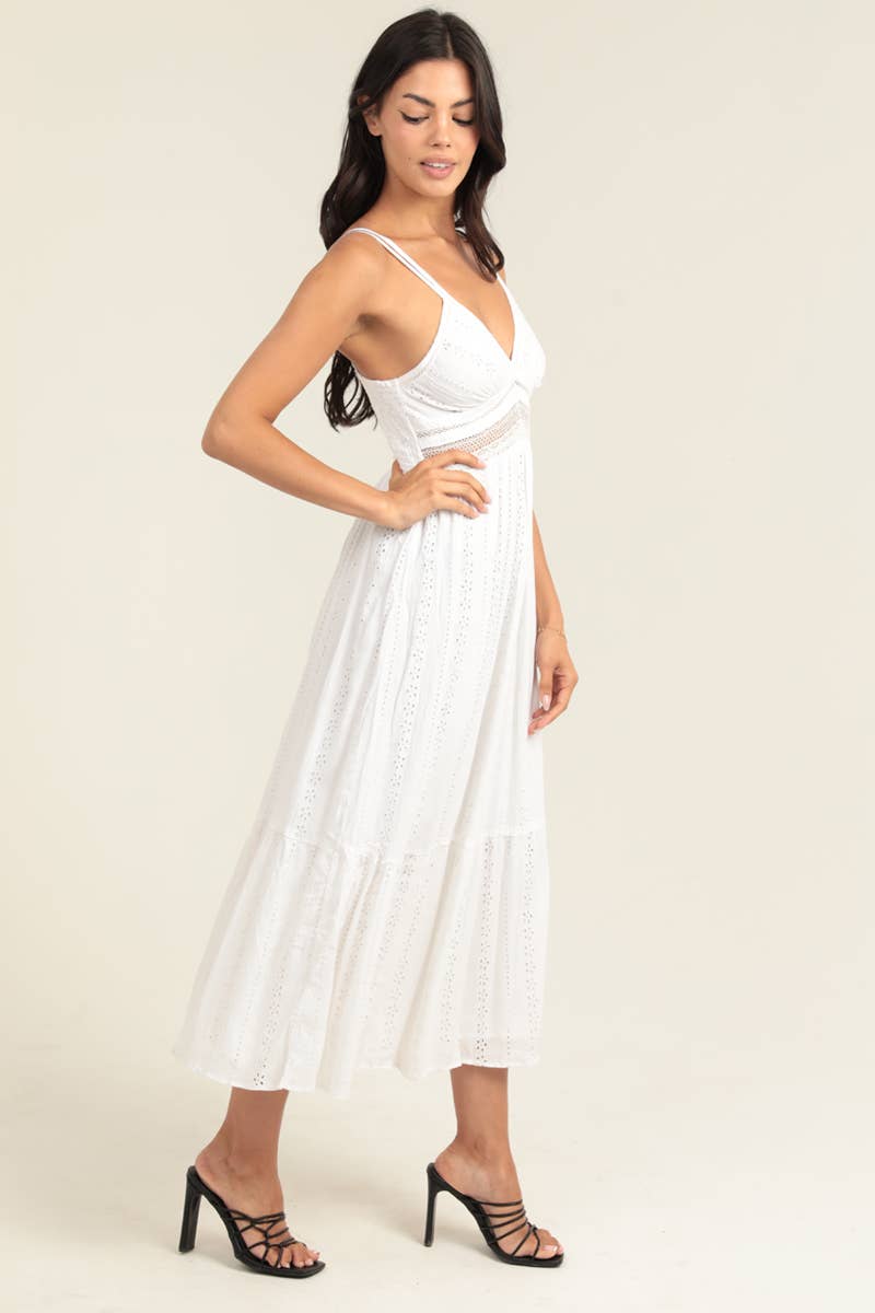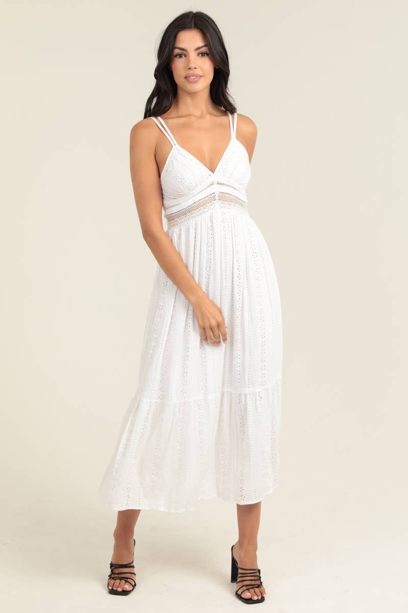 Designed with delicate eyelet embroidery, double straps, a flattering v-neckline, and a flowy tiered midi skirt, this dress moves beautifully with every step. The lace inset detailing adds a dreamy, elevated touch that feels boutique and timeless.