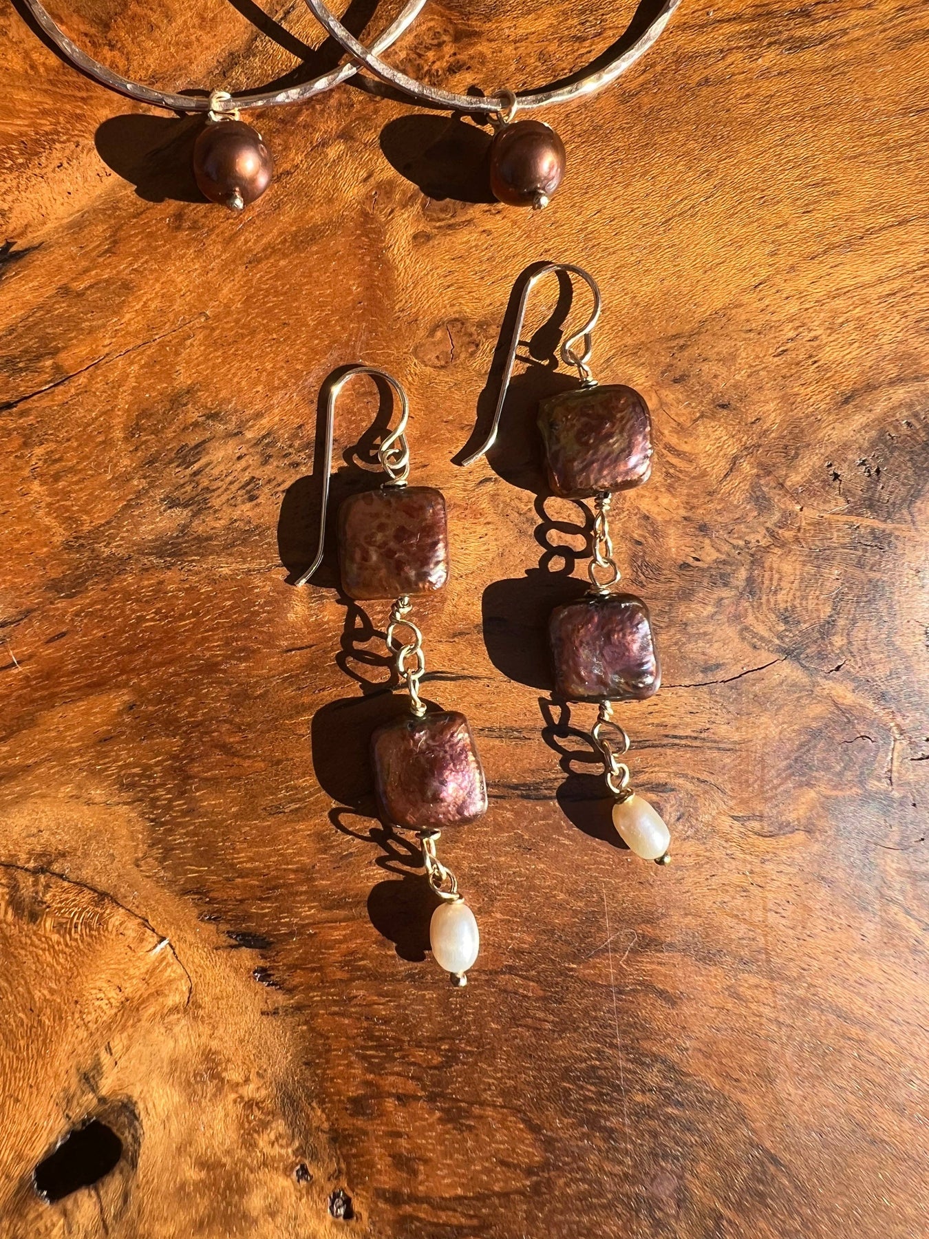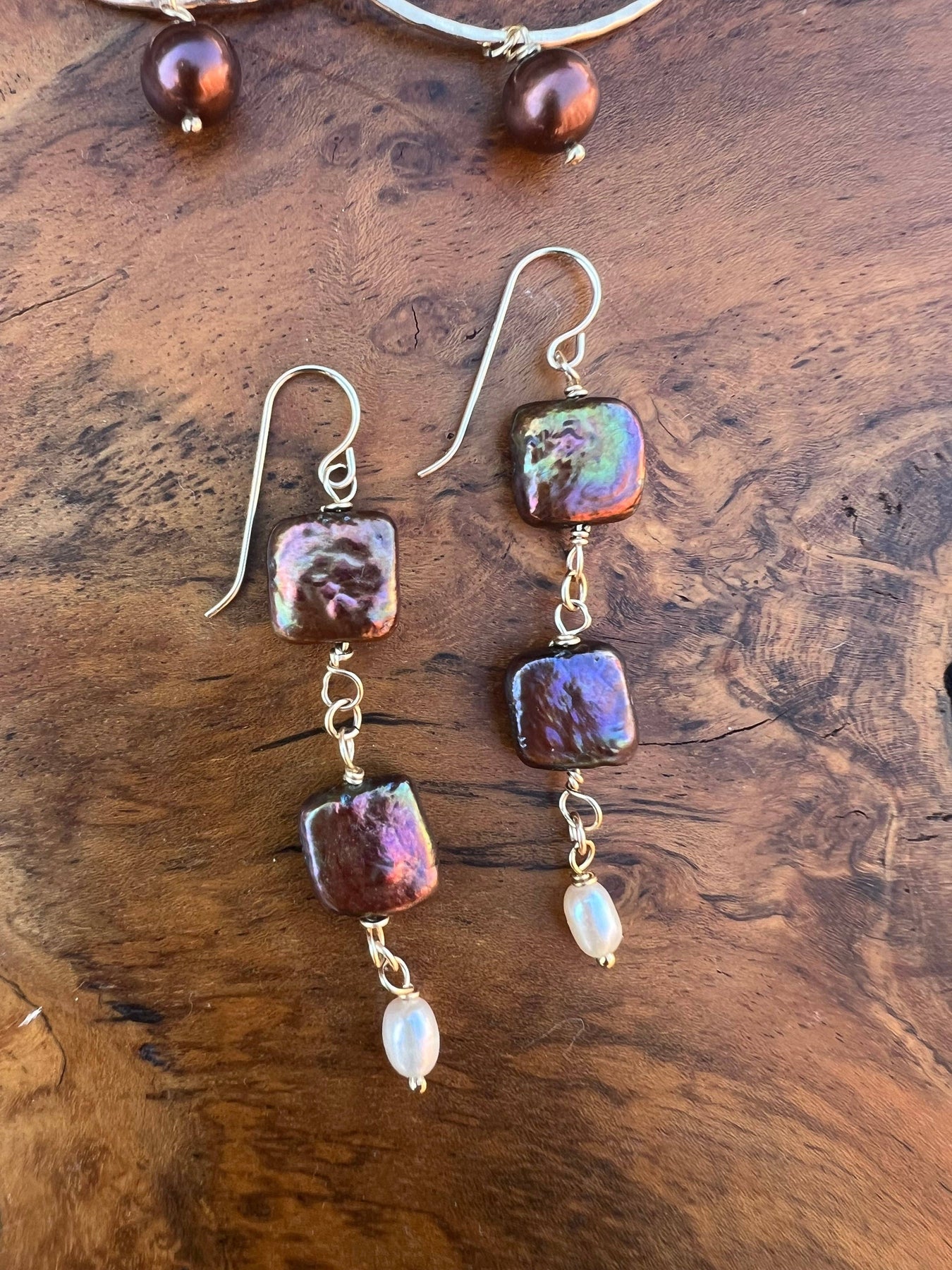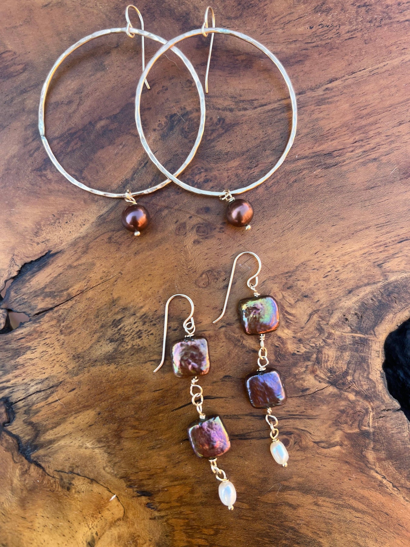 Expertly handcrafted, the Xocoatl Drops Earrings are designed to turn heads with their chocolate-inspired shimmer and elegant drop design. Each pair features abalone beads, luminous teardrop keshi pearls, and gold filled wire wrapping for a luxe artisan finish. Hypoallergenic ear hooks provide all-day comfort, while the 2” length offers the perfect balance of bold and refined style.